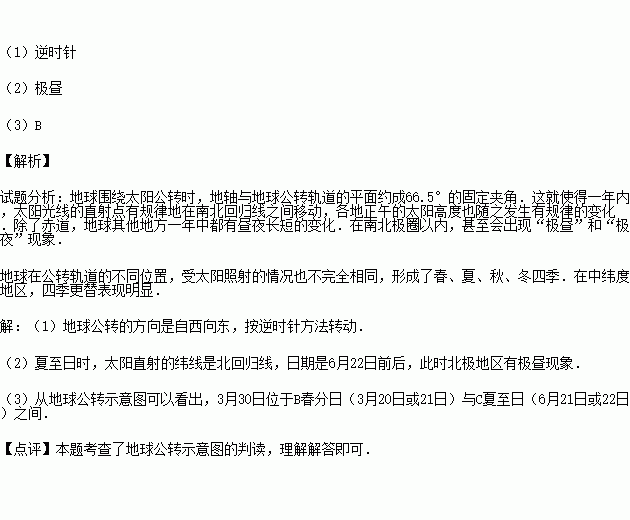 (1)图中E处箭头地球的公转方向为 (逆时针或顺时针).