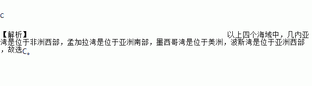 C 【解析】以上四个海域中,几内亚湾是位于非洲西部,孟加拉湾是位于亚洲南部,墨西哥湾是位于美洲,波斯湾是位于亚洲西部,故选C。