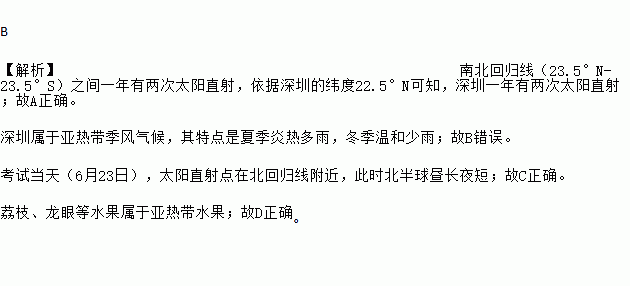 B 【解析】南北回归线(23.5°N-23.5°S)之间一年有两次太阳直射,依据深圳的纬度22.5°N可知,深圳一年有两次太阳直射;故A正确。 深圳属于亚热带季风气候,其特点是夏季炎热多雨,冬季温和少雨;故B错误。 考试当天(6月23日),太阳直射点在北回归线附近,此时北半球昼长夜短;故C正确。 荔枝、龙眼等水果属于亚热带水果;故D正确。