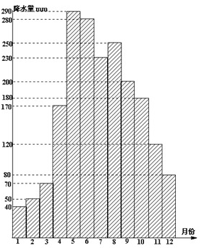 | 降水量(毫米) | 40 | 50 | 70 | 170 | 290 | 280 | 230 | 250 | 200 | 180 | 120 | 80 |