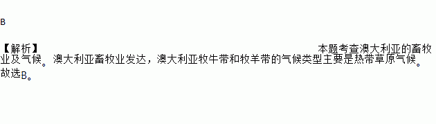 B 【解析】本题考查澳大利亚的畜牧业及气候。澳大利亚畜牧业发达,澳大利亚牧牛带和牧羊带的气候类型主要是热带草原气候。故选B。