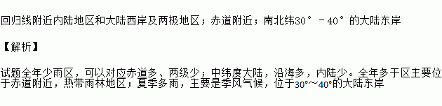 全年少雨区主要分布在 ________,全年多雨区主要分布在 ________,夏季多雨区主要分布在 ________.