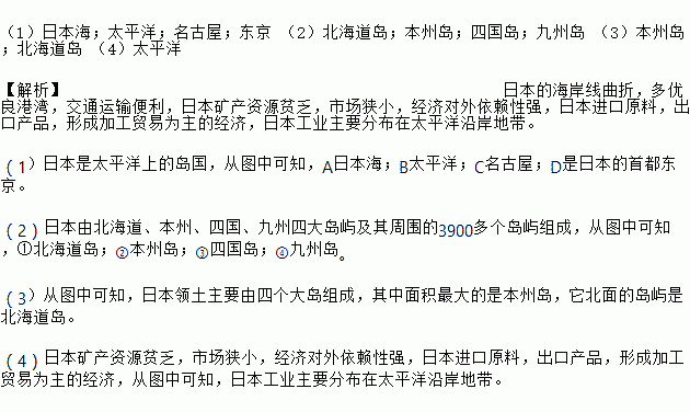 £¨1£©ÈÕ±¾º££»Ì«Æ½Ñó£»Ãû¹ÅÎÝ£»¶«¾© £¨2£©±±º£µÀµº£»±¾Öݵº£»ËĹúµº£»¾ÅÖݵº £¨3£©±¾Öݵº£»±±º£µÀµº £¨4£©Ì«Æ½Ñó ¡¾½âÎö¡¿ÈÕ±¾µÄº£°¶ÏßÇúÕÛ£¬¶àÓÅÁ¼¸ÛÍ壬½»Í¨ÔËÊä±ãÀû£¬ÈÕ±¾¿ó²ú×ÊԴƶ·¦£¬Êг¡ÏÁС£¬¾¼Ã¶ÔÍâÒÀÀµÐÔÇ¿£¬ÈÕ±¾½ø¿ÚÔÁÏ£¬³ö¿Ú²úÆ·£¬Ðγɼӹ¤Ã³Ò×ΪÖ÷µÄ¾¼Ã£¬ÈÕ±¾¹¤ÒµÖ÷Òª·Ö²¼ÔÚ̫ƽÑóÑØ°¶µØ´ø¡£ £¨1£©ÈÕ±¾ÊÇ̫ƽÑóÉϵĵº¹ú£¬´ÓͼÖпÉÖª£¬AÈÕ±¾º££»B̫ƽÑó£»CÃû¹ÅÎÝ£»DÊÇÈÕ±¾µÄÊ×¶¼¶«¾©¡£ ...
