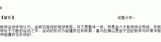 B ¡¾½âÎö¡¿ÊÔÌâ·ÖÎö£º °å¿éÔ˶¯Ñ§ËµÈÏΪ£¬ÓÉÑÒʯ×é³ÉµÄµØÇò±í²ã£¬²¢²»ÊÇÕûÌåÒ»¿é£¬¶øÊÇÓÉÁù´ó°å¿éÆ´ºÏ¶ø³É£®¸÷°å¿é´¦ÓÚ²»¶ÏµÄÔ˶¯Ö®ÖУ®Ô˶¯µÄÐÎʽΪÅöײ¼·Ñ¹ºÍÕÅÁÑ£®Ï²ÂíÀÑÅɽÊÇÓÉÓÚÑÇÅ·°å¿éÓëÓ¡¶ÈÑó°å¿éÅöײ¼·Ñ¹Ðγɵģ®