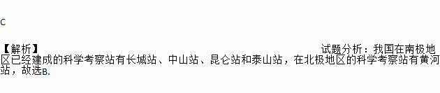 C 【解析】试题分析:我国在南极地区已经建成的科学考察站有长城站、中山站、昆仑站和泰山站,在北极地区的科学考察站有黄河站,故选B.