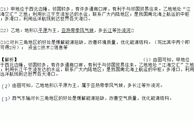 £¨1£©¼×µØÎ»ÓÚÎ÷±±±ßÚÁÚ¹ú½Ï¶à£¬ÓÐÐí¶àͨÉ̿ڰ¶£¬ÓÐÀûÓÚÓëÁÚ¹úóÒ×ÍùÀ´¡£Òҵصش¦¡°½º£½»»ã¡±Ö®µØ£»ÀûÓ󤽸ÉÖ§Á÷·¢´ïµÄË®ÔË£¬ÁªÏµ¹ã´óÄÚ½µØÇø£»ÊÇÎÒ¹úÄϱ±º£ÉϺ½Ô˵ÄÖÐÊࣻ¶à¸Û¿Ú£¬ÀûÓÃÔ¶Ñóº½Ïßµ½´ïÊÀ½ç¸÷´ó¸Û¿Ú¡£ £¨2£©ÒҵأºµØÐÎÒÔÆ½ÔΪÖ÷£¬ÑÇÈÈ´ø¼¾·çÆøºò£¬¶à³¤½µÈÍâÁ÷ºÓ¡£ £¨3£©¶Ô³¤Èý½ÇµØÇøµÄºÃ´¦ÊÇ»º½âÄÜÔ´¶Ìȱ£¬¸ÄÉÆ»·¾³ÖÊÁ¿£¬ÓÅ»¯ÄÜÔ´½á¹¹¡££¨Ð´³öÆäÖÐÁ½¸ö¼´¿ÉµÃ2·Ö£©£» ×ʽ𡢼¼Êõ¡¢ÐÅÏ¢µÈ ...