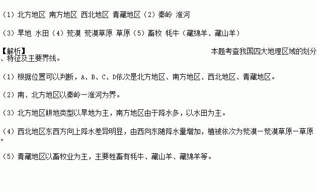 (5)D地区农业生产以_____业为主,主要的牲畜有_____。(举一例即可)