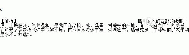 C 【解析】四川盆地的西部的成都平原,土壤肥沃,气候温和,是我国商品粮、棉、桑蚕、甘蔗等的产地,有“天府之国”的美誉;鱼米之乡是指长江中下游平原,该地区水资源丰富,河湖密布,热量充足,主要种植的农作物是水稻。故选C。