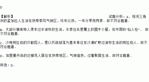 D 【解析】试题分析:A.恒河三角洲的孟加拉人生活在热带季风气候区,终年炎热,一年分旱雨两季.故不符合题意. B.大部分雅库特人原本过半游牧的生活,冬季住处是覆土的圆木小屋,在中国称“仙人柱”. 故不符合题意. C.沙特阿拉伯的贝都因人,是以氏族部落为基本单位在沙漠旷野过游牧生活的阿拉伯人.故不符合题意. D.加里曼丹岛的达雅克人居住在热带地区,气候湿热,过着聚居生活.故符...