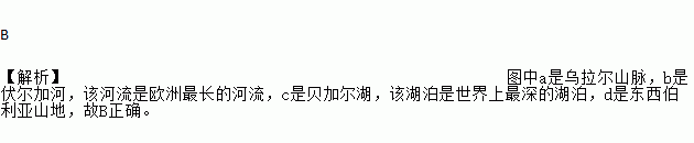 B 【解析】图中a是乌拉尔山脉,b是伏尔加河,该河流是欧洲最长的河流,c是贝加尔湖,该湖泊是世界上最深的湖泊,d是东西伯利亚山地,故B正确。