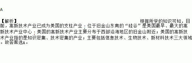 A 【解析】根据所学的知识可知,目前,高新技术产业已成为美国的支柱产业;位于旧金山东南的“硅谷”是美国最早、最大的高新技术产业中心;美国的高新技术产业主要分布于西部沿海地区的旧金山附近;美国的高新技术产业指的是知识密集、技术密集的产业;主要包括信息技术、生物技术、新材料技术三大领域。故答案选A。