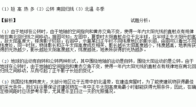 £¨1£©¹Û²ìÏÖÏó£º×óͼÖУ¬Ïļ¾Â¥·¿Ó°×Ó½Ï £¨³¤/¶Ì£©£¬ËµÃ÷Ïļ¾ÕýÎçÌ«ÑôÉýµÃ½Ï £¨¸ß/µÍ£©¡£ÓÒͼÖУ¬ ´øÓ°×Ó×î¶Ì£¬¸Ãγ¶ÈµØ´ø»ñµÃµÄÌ«Ñô¹âÈÈ½Ï £¨¶à/ÉÙ£©¡£