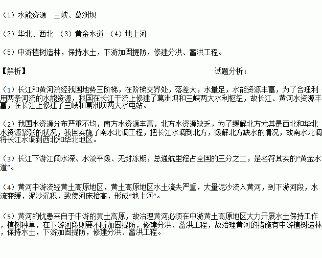 (1)长江、黄河上游河段落差大, 资源十分丰富,有利于兴建水电站。其中长江三峡段有两个大型水利枢纽工程,即 水电站和 水电站。
