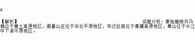 A 【解析】试题分析:秦始皇陵兵马俑位于黄土高原地区,避暑山庄位于华北平原地区,布达拉宫位于青藏高原地区,黄山位于长江中下游平原地区。