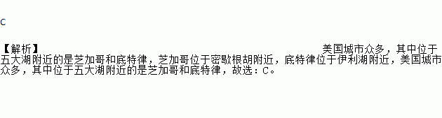 C 【解析】美国城市众多,其中位于五大湖附近的是芝加哥和底特律,芝加哥位于密歇根胡附近,底特律位于伊利湖附近,美国城市众多,其中位于五大湖附近的是芝加哥和底特律,故选:C。