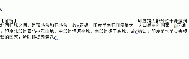 C 【解析】印度绝大部分位于赤道到北回归线之间,是豫热带和亚热带,故A正确;印度是南亚面积最大、人口最多的国家,B正确;印度北部是喜马拉雅山地,中部是恒河平原,南部是德干高原,故C错误;印度是水旱灾害频繁的国家。所以根据题意选C。