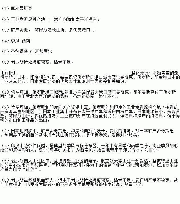 (2)俄罗斯和印度在工业分布上的相同点是_____ ,而日本工业多分布在 。
