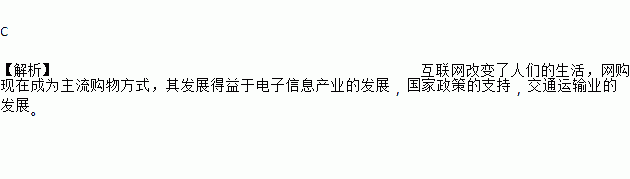 C 【解析】互联网改变了人们的生活,网购现在成为主流购物方式,其发展得益于电子信息产业的发展,国家政策的支持,交通运输业的发展。