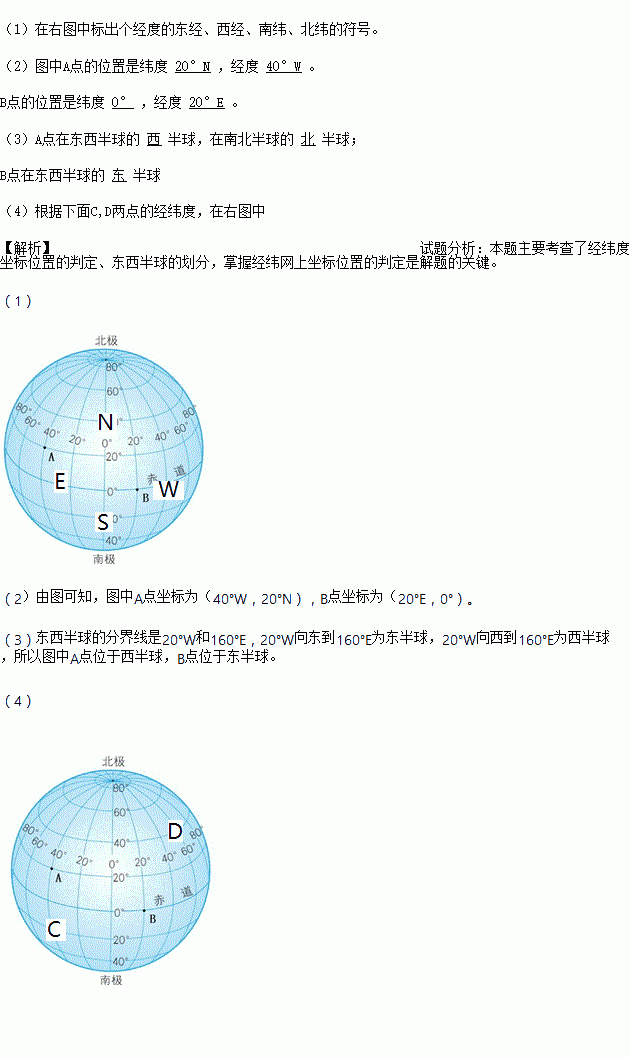 (3)A点在东西半球的 半球,在南北半球的 半球;B点在东西半球的 半球