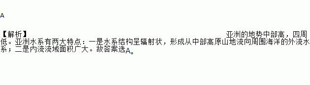 A 【解析】亚洲的地势中部高,四周低。亚洲水系有两大特点:一是水系结构呈辐射状,形成从中部高原山地流向周围海洋的外流水系;二是内流流域面积广大。故答案选A。