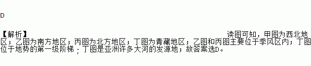 D ¡¾½âÎö¡¿¶Áͼ¿ÉÖª£¬¼×ͼΪÎ÷±±µØÇø£»ÒÒͼΪÄÏ·½µØÇø£»±ûͼΪ±±·½µØÇø£»¶¡Í¼ÎªÇà²ØµØÇø£»ÒÒͼºÍ±ûͼÖ÷ҪλÓÚ¼¾·çÇøÄÚ£»¶¡Í¼Î»ÓÚµØÊƵĵÚÒ»¼¶½×ÌÝ£»¶¡Í¼ÊÇÑÇÖÞÐí¶à´óºÓµÄ·¢Ô´µØ£»¹Ê´ð°¸Ñ¡D¡£