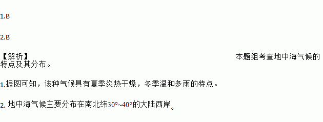 1.B 2.B 【解析】本题组考查地中海气候的特点及其分布。 1.据图可知,该种气候具有夏季炎热干燥,冬季温和多雨的特点。 2. 地中海气候主要分布在南北纬30°~40°的大陆西岸。