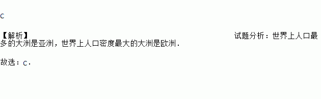 C 【解析】试题分析:世界上人口最多的大洲是亚洲,世界上人口密度最大的大洲是欧洲. 故选:C.