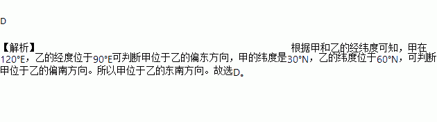 有两艘轮船,甲位于(120°E,30°N),乙位于(90°E,60°N),甲船位于乙船的( )