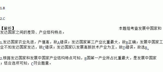 1.B 2.C 【解析】本题组考查发展中国家和发达国家之间的差异、产业结构特点。 1.发达国家农业先进,产值高,故A错误;发达国家第三产业比重最大,故B正确;发展中国家工业不如发达国家发达,故C错误;发达国家以发展高新技术产业为主,故D错误。故选B。 2.根据发达国家和发展中国家产业结构特点可知,B国第一产业所占比重最大,是发展中国家;结合选项可知,C符合题意。