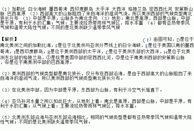 £¨1£©¼ÓÀÕ±È °×ÁϿ Ä«Î÷¸çÍå Î÷Ó¡¶ÈȺµº ̫ƽÑó ´óÎ÷Ñó ¸ñÁêÀ¼µº ÃÜÎ÷Î÷±ÈºÓ °²µÚ˹ɽÂö °ÍÎ÷¸ßÔ £¨2£©Î÷²¿¸ß´óµÄɽÂö×èµ²ÁËÀ´×Ôº£ÑóµÄʪÈóÆøÁ÷£¬ËùÒÔÃÀÖÞÎ÷²¿µÄÆøºòÀàÐÍÄϱ±ÏÁ³¤·Ö²¼ £¨3£©Öв¿ÊÇÆ½Ô£¬É½Âö¶àΪÄϱ±×ßÏò £¨3£©µØÐΣºÄϱ±ÊǸßÔ£¬Î÷²¿ÊÇɽÂö£¬Öв¿ÊÇÆ½Ô£¬ÓÐÀûÓÚË®µÄ»ã¼¯£»Æøºò£ºÖ÷ÒªÁ÷¾ÈÈ´øÓêÁÖÆøºòÇø£¬½µË®·á¸» £¨4£©¶¼ÓÐÑÇÈÈ´ø¼¾·çÆøºòºÍδø´ó½ÐÔÆøºò£»²»Í¬µÄÊDZ±ÃÀÖÞȱÉÙδø¼¾·çÆøºò...