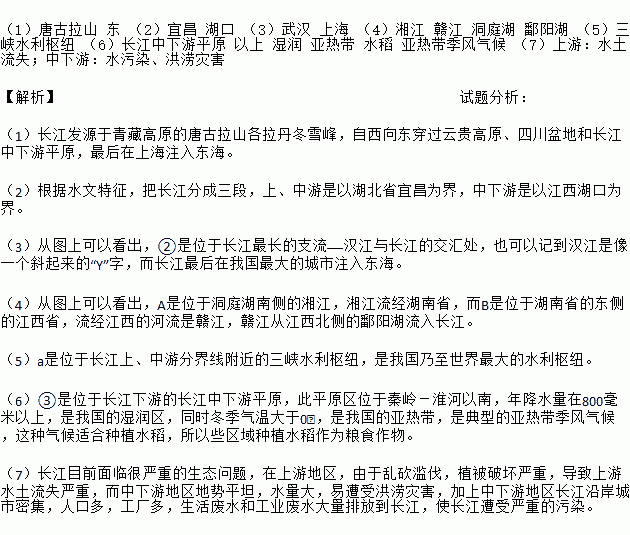 (1)唐古拉山 东 (2)宜昌 湖口 (3)武汉 上海 (4)湘江 赣江 洞庭湖 鄱阳湖 (5)三峡水利枢纽 (6)长江中下游平原 以上 湿润 亚热带 水稻 亚热带季风气候 (7)上游:水土流失;中下游:水污染、洪涝灾害 【解析】试题分析: (1)长江发源于青藏高原的唐古拉山各拉丹冬雪峰,自西向东穿过云贵高原、四川盆地和长江中下游平原,最后在上海注入东海。 (2)根据水文特征,把...