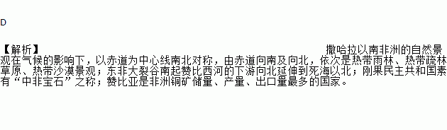 D 【解析】撒哈拉以南非洲的自然景观在气候的影响下,以赤道为中心线南北对称,由赤道向南及向北,依次是热带雨林、热带疏林草原、热带沙漠景观;东非大裂谷南起赞比西河的下游向北延伸到死海以北;刚果民主共和国素有“中非宝石”之称;赞比亚是非洲铜矿储量、产量、出口量最多的国家。