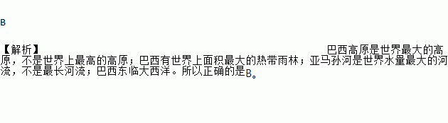 B ¡¾½âÎö¡¿°ÍÎ÷¸ßÔÊÇÊÀ½ç×î´óµÄ¸ßÔ£¬²»ÊÇÊÀ½çÉÏ×î¸ßµÄ¸ßÔ£»°ÍÎ÷ÓÐÊÀ½çÉÏÃæ»ý×î´óµÄÈÈ´øÓêÁÖ£»ÑÇÂíËïºÓÊÇÊÀ½çË®Á¿×î´óµÄºÓÁ÷£¬²»ÊÇ×ºÓÁ÷£»°ÍÎ÷¶«ÁÙ´óÎ÷Ñó¡£ËùÒÔÕýÈ·µÄÊÇB¡£
