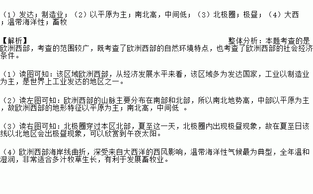 (1)发达;制造业;(2)以平原为主;南北高,中间低;(3)北极圈;极昼;(4)大西;温带海洋性;畜牧 【解析】整体分析:本题考查的是欧洲西部,考查的范围较广,既考查了欧洲西部的自然环境特点,也考查了欧洲西部的社会经济条件。 (1)读图可知:该区域欧洲西部,从经济发展水平来看,该区域多为发达国家,工业以制造业为主,是世界上工业发达的地区之一。 (2)读左图可知:欧洲西部的山脉主要...