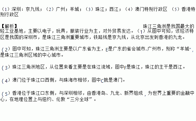 (1)深圳:京九线;(2)广州;羊城;(3)珠江;西江;(4)澳门特别行政区 (5)香港特别行政区 【解析】珠江三角洲是我国最大的轻工业基地,主要以电子,玩具,服装行业为主,对外贸易发达。(1)从图中可知,该经济特区是我国的深圳市,是珠江三角洲重要城市,铁路线是京九线,从北京出发到香港的九龙。 (2)图中可知,珠江三角洲主要是以广东省为主,E是广东的省会城市-广州市,别称“羊城” , ...