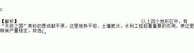 C 【解析】以上四个地形区中,有“天府之国”美称的是成都平原,这里地势平坦、土壤肥沃,水利工程起着重要的作用,使这里粮食产量稳定,故选C。