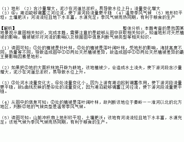 (1)地形 (2)含沙量增大,泥沙在河道总淤积,易导致水位上升;流量变化增大 (3)④;湖泊能够调蓄江河径流,使下游河段流量更平稳 (4)温带季风气候 (5)地形较平坦;土壤肥沃;河流流经且地下水丰富,水源充足;季风气候雨热同期,有利于粮食的生产 【解析】整体分析:本题考查的是我国某地景观示意图相关知识,完成本题,需要注意的是能够从图中获取相关知识,知道地形对天然植被的影响,植被破坏对河流的...