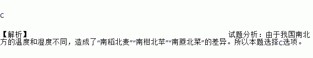 C 【解析】试题分析:由于我国南北方的温度和湿度不同,造成了“南稻北麦”“南柑北苹”“南蔗北菜”的差异。所以本题选择C选项。