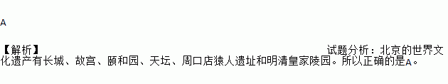 A 【解析】试题分析:北京的世界文化遗产有长城、故宫、颐和园、天坛、周口店猿人遗址和明清皇家陵园。所以正确的是A。