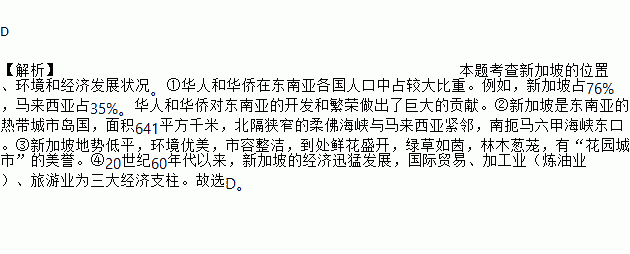 D 【解析】本题考查新加坡的位置、环境和经济发展状况。①华人和华侨在东南亚各国人口中占较大比重。例如,新加坡占76%,马来西亚占35%。华人和华侨对东南亚的开发和繁荣做出了巨大的贡献。②新加坡是东南亚的热带城市岛国,面积641平方千米,北隔狭窄的柔佛海峡与马来西亚紧邻,南扼马六甲海峡东口。③新加坡地势低平,环境优美,市容整洁,到处鲜花盛开,绿草如茵,林木葱茏,有“花园城市”的美誉。④20世纪...