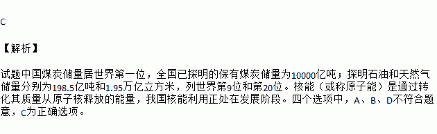 A. 石油 B. 天然气 C. 煤炭 D. 核能