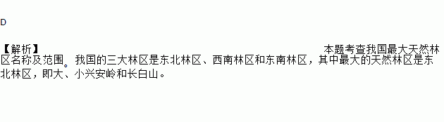 D 【解析】本题考查我国最大天然林区名称及范围。我国的三大林区是东北林区、西南林区和东南林区,其中最大的天然林区是东北林区,即大、小兴安岭和长白山。