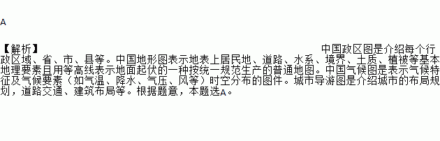 A 【解析】中国政区图是介绍每个行政区域、省、市、县等。中国地形图表示地表上居民地、道路、水系、境界、土质、植被等基本地理要素且用等高线表示地面起伏的一种按统一规范生产的普通地图。中国气候图是表示气候特征及气候要素(如气温、降水、气压、风等)时空分布的图件。城市导游图是介绍城市的布局规划,道路交通、建筑布局等。根据题意,本题选A。
