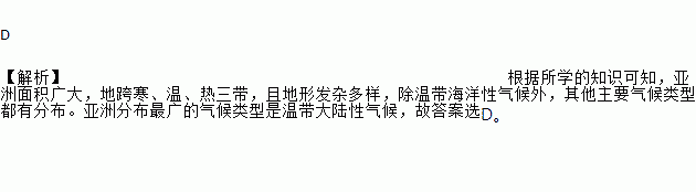 D 【解析】根据所学的知识可知,亚洲面积广大,地跨寒、温、热三带,且地形发杂多样,除温带海洋性气候外,其他主要气候类型都有分布。亚洲分布最广的气候类型是温带大陆性气候,故答案选D。