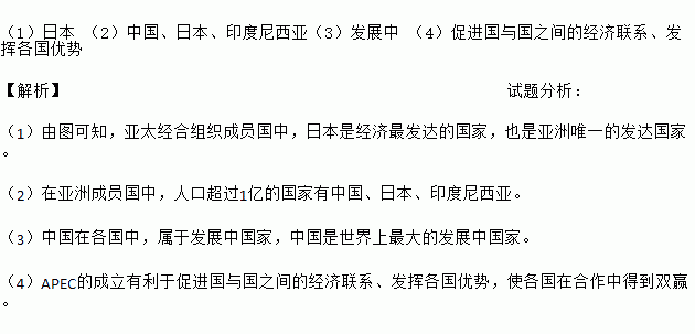 £¨1£©ÈÕ±¾ £¨2£©Öйú¡¢ÈÕ±¾¡¢Ó¡¶ÈÄáÎ÷ÑÇ£¨3£©·¢Õ¹ÖÐ £¨4£©´Ù½ø¹úÓë¹úÖ®¼äµÄ¾¼ÃÁªÏµ¡¢·¢»Ó¸÷¹úÓÅÊÆ ¡¾½âÎö¡¿ÊÔÌâ·ÖÎö£º £¨1£©ÓÉͼ¿ÉÖª£¬ÑÇÌ«¾ºÏ×éÖ¯³ÉÔ±¹úÖУ¬ÈÕ±¾ÊǾ¼Ã×î·¢´ïµÄ¹ú¼Ò£¬Ò²ÊÇÑÇÖÞΨһµÄ·¢´ï¹ú¼Ò¡£ £¨2£©ÔÚÑÇÖÞ³ÉÔ±¹úÖУ¬È˿ڳ¬¹ý1ÒڵĹú¼ÒÓÐÖйú¡¢ÈÕ±¾¡¢Ó¡¶ÈÄáÎ÷ÑÇ¡£ £¨3£©ÖйúÔÚ¸÷¹úÖУ¬ÊôÓÚ·¢Õ¹Öйú¼Ò£¬ÖйúÊÇÊÀ½çÉÏ×î´óµÄ·¢Õ¹Öйú¼Ò¡£ £¨4£©APECµÄ³ÉÁ¢ÓÐÀûÓÚ...