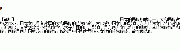 A. 西服 B. 和服 C. 旗袍 D. 牛仔服