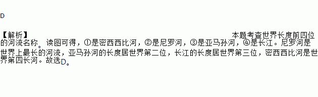 D 【解析】本题考查世界长度前四位的河流名称。读图可得,①是密西西比河,②是尼罗河,③是亚马孙河,④是长江。尼罗河是世界上最长的河流,亚马孙河的长度居世界第二位,长江的长度居世界第三位,密西西比河是世界第四长河。故选D。