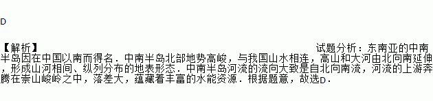 D ¡¾½âÎö¡¿ÊÔÌâ·ÖÎö£º¶«ÄÏÑǵÄÖÐÄϰ뵺ÒòÔÚÖйúÒÔÄ϶øµÃÃû£®ÖÐÄϰ뵺±±²¿µØÊƸ߾þ£¬ÓëÎÒ¹úɽˮÏàÁ¬£¬¸ßɽºÍ´óºÓÓɱ±ÏòÄÏÑÓÉ죬ÐγÉɽºÓÏà¼ä¡¢×ÝÁзֲ¼µÄµØ±íÐÎ̬£®ÖÐÄϰ뵺ºÓÁ÷µÄÁ÷Ïò´óÖÂÊÇ×Ô±±ÏòÄÏÁ÷£¬ºÓÁ÷µÄÉÏÓα¼ÌÚÔÚ³çɽ¾þÁëÖ®ÖУ¬Âä²î´ó£¬Ô̲Ø×ŷḻµÄË®ÄÜ×ÊÔ´£®¸ù¾ÝÌâÒ⣬¹ÊÑ¡D£®