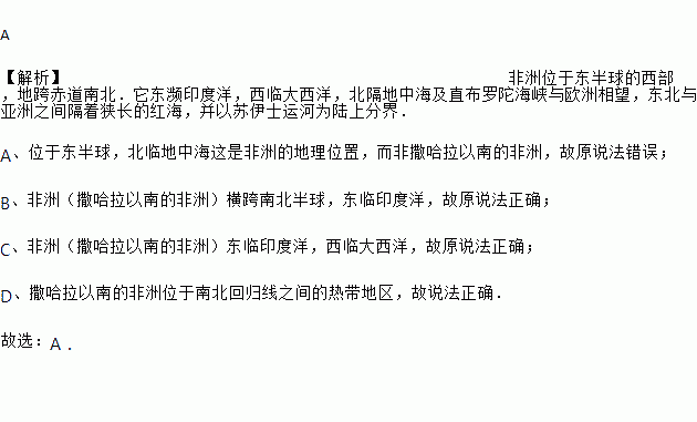 A 【解析】非洲位于东半球的西部,地跨赤道南北.它东濒印度洋,西临大西洋,北隔地中海及直布罗陀海峡与欧洲相望,东北与亚洲之间隔着狭长的红海,并以苏伊士运河为陆上分界. A、位于东半球,北临地中海这是非洲的地理位置,而非撒哈拉以南的非洲,故原说法错误; B、非洲(撒哈拉以南的非洲)横跨南北半球,东临印度洋,故原说法正确; C、非洲(撒哈拉以南的非洲)东临印度洋,西临大西洋,故...