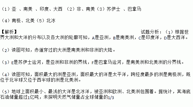 (1)亚 、南美 、印度、大西 (2)非、南美(3)苏伊士 、巴拿马 (4)南极、北美(5)北冰 【解析】试题分析:(1)根据世界大洲和大洋的分布以及各大洲的轮廓可知,A是亚洲,B是南美洲,C是印度洋,D是大西洋。 (2)读图可知,赤道穿过的大洲是南美洲和非洲的大陆。 (3)E是苏伊士运河,是亚洲和非洲的界线,F是巴拿马运河,是南美洲和北美洲的分界线。 (4)读图可知...